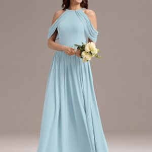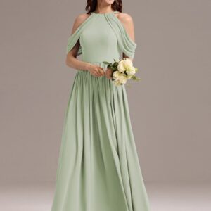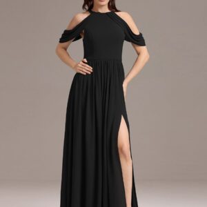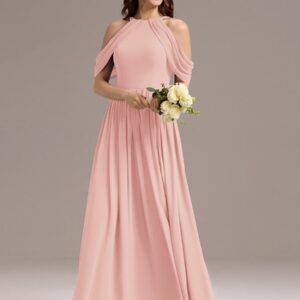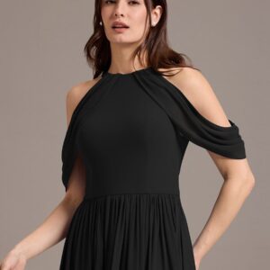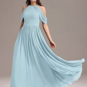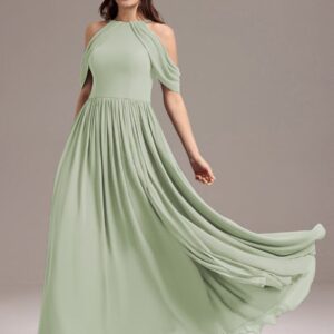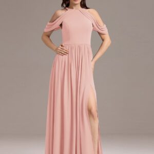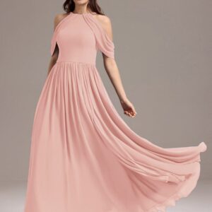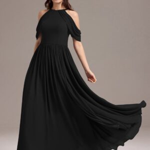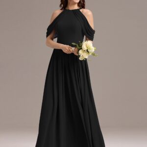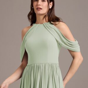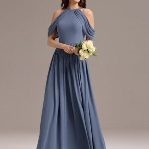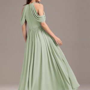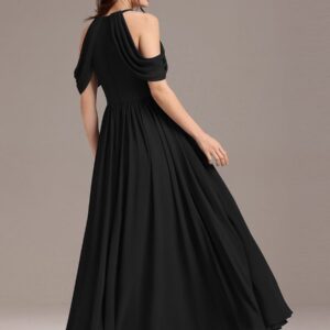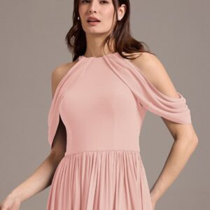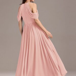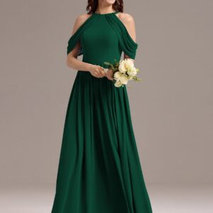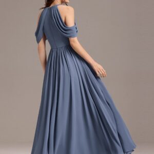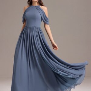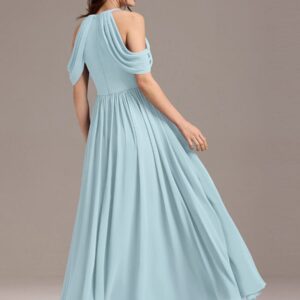 Step into elegance with this stunning chiffon bridesmaid dress featuring a cold shoulder design that beautifully showcases your arms. The draped sleeves add a sophisticated touch, enhancing the overall look. The flattering A-line silhouette flows gracefully, ensuring comfort and ease for any celebration. Perfect for weddings or formal events, this dress allows you to feel both stylish and confident while you celebrate alongside loved ones.