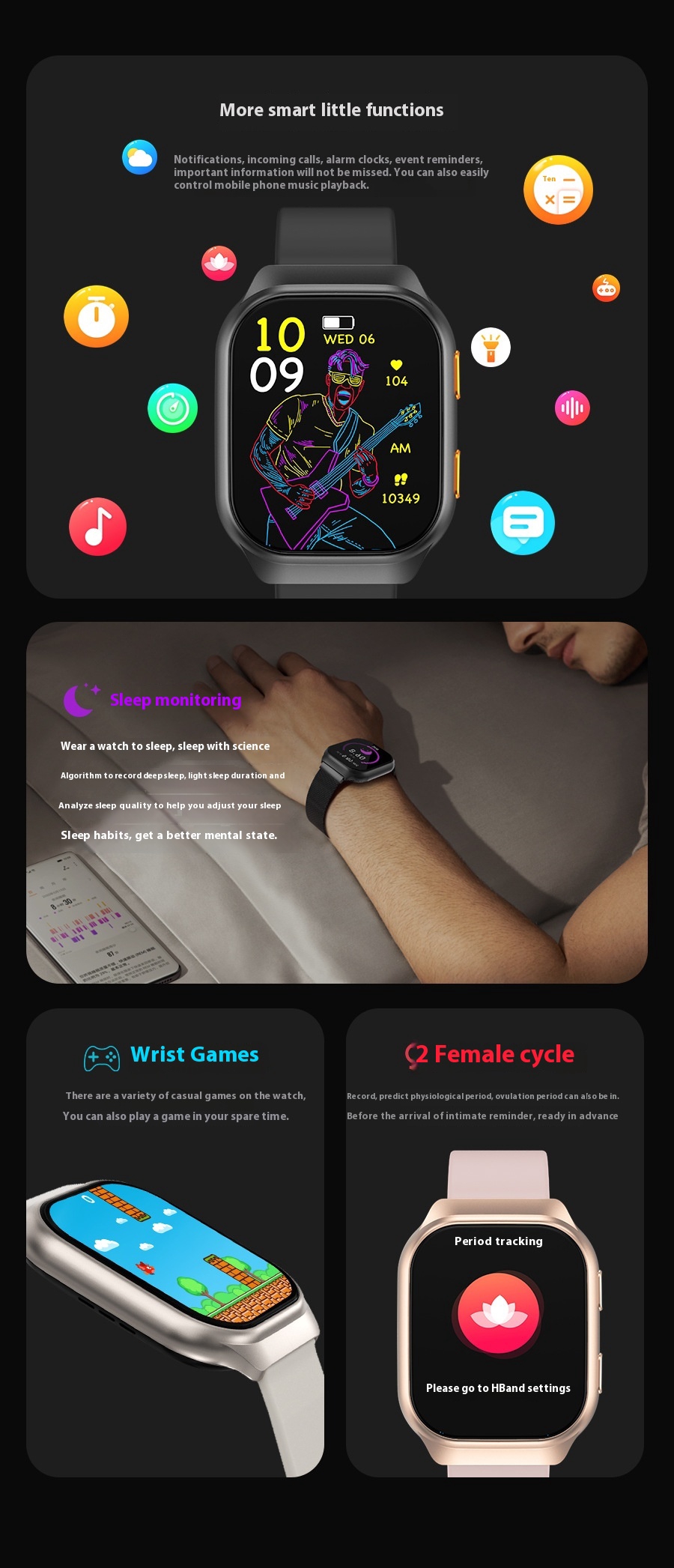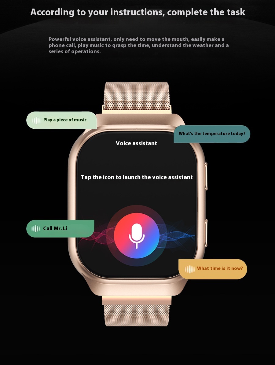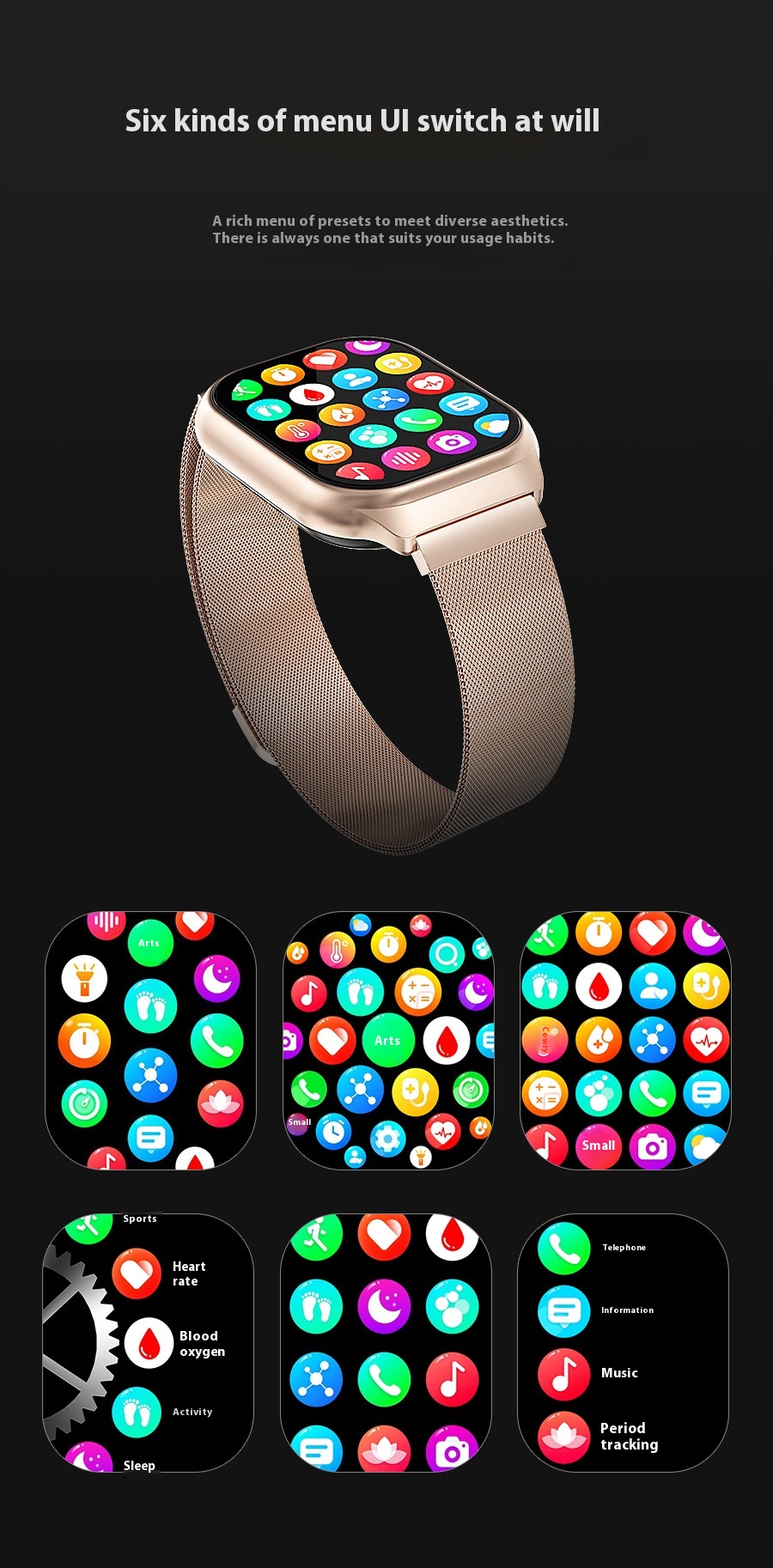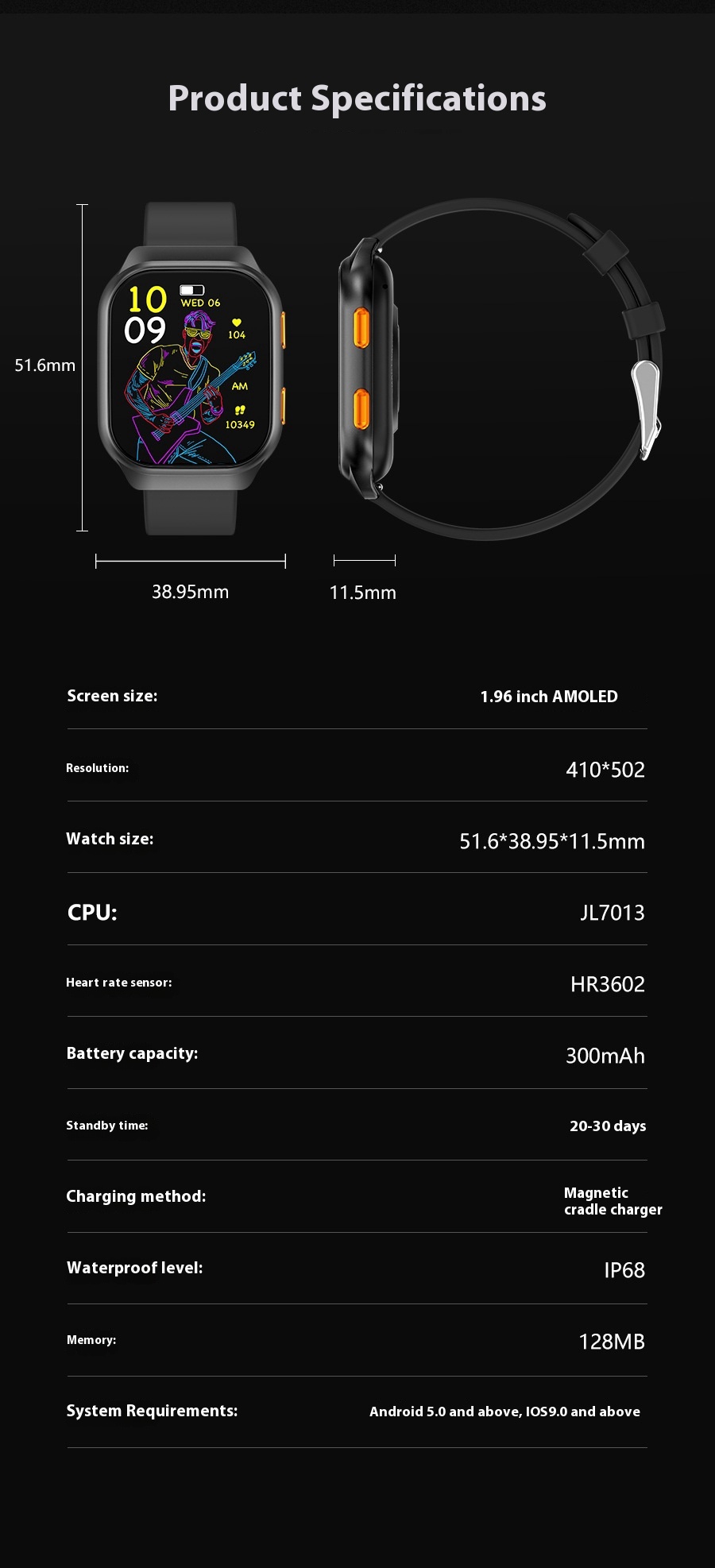 Functions: Waterproof, photo taking, step counting, heart rate monitoring, blood pressure measurement, social entertainment, Bluetooth call, smart reminder, remote control selfie, sleep monitoring, blood oxygen detection