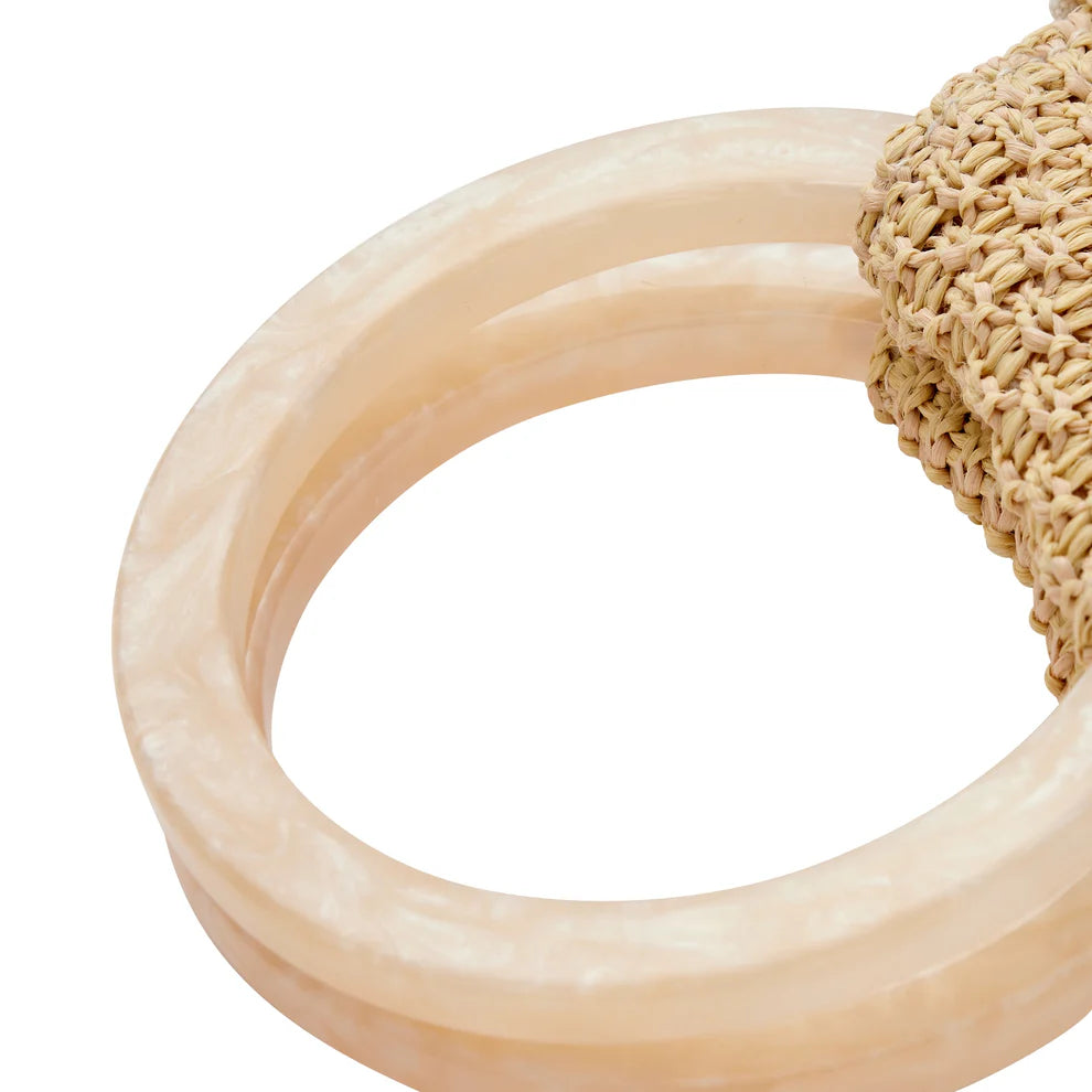 Timeless Tweed: Crafted with a chic raffia tweed body, this bracelet clutch exudes sophistication, while the resin handles add a playful, polished touch.