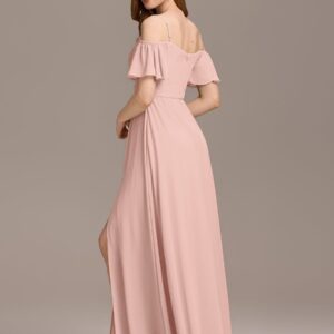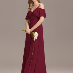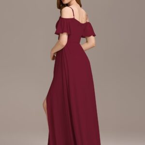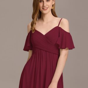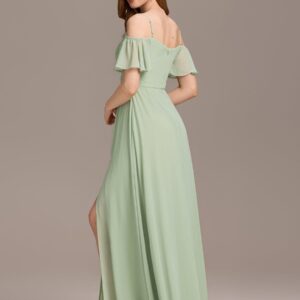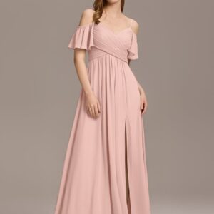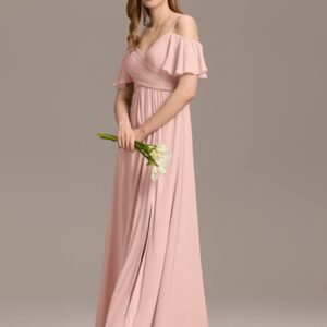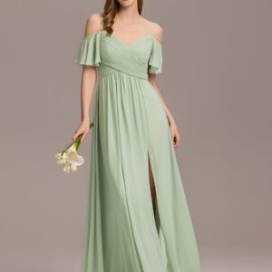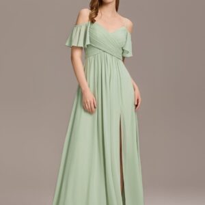 This elegant off-shoulder dress features a flattering ruched bodice that accentuates your curves beautifully. The high side slit adds a touch of allure, making it perfect for special occasions. With delicate slim straps, it offers a comfortable fit while showcasing your shoulders, this dress is ideal for bridesmaids who want to stand out with grace.