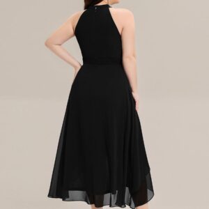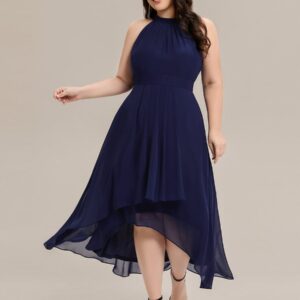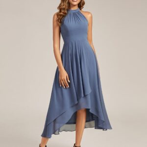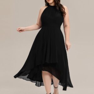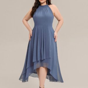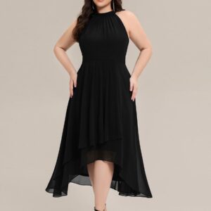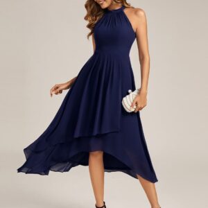 This sleeveless chiffon midi dress blends elegance and ease in a silhouette designed to flatter and flow. The high neckline is softly pleated for texture, while the high-low hem adds movement and a modern touch. Its A-line shape creates a graceful drape that suits everything from outdoor weddings to cocktail parties and evening dinners.