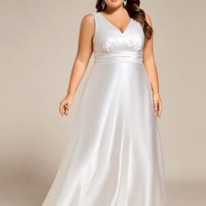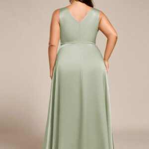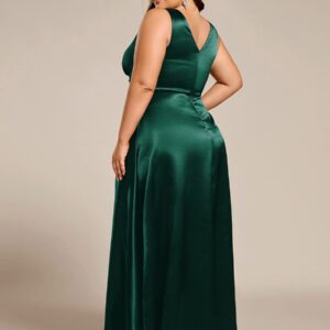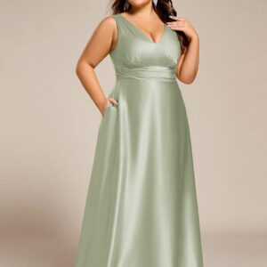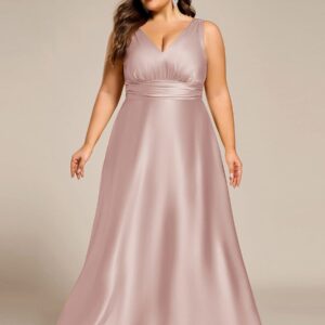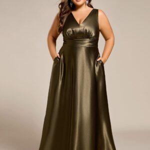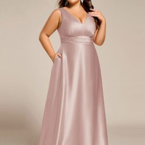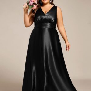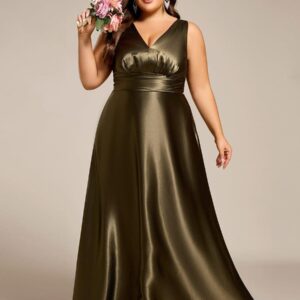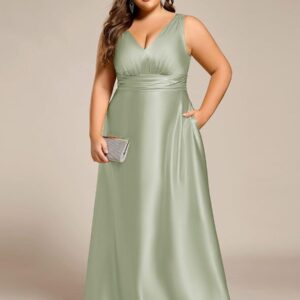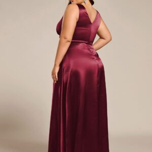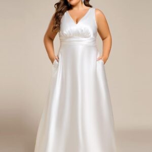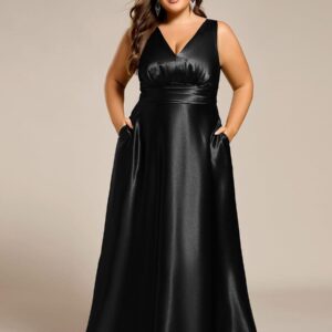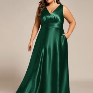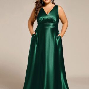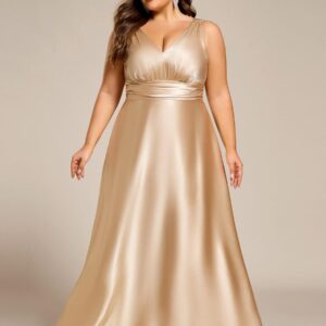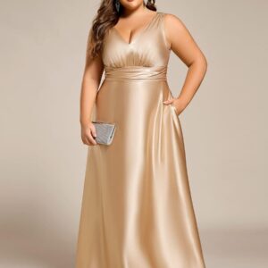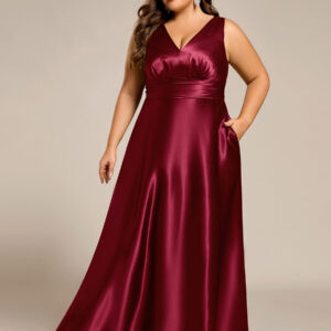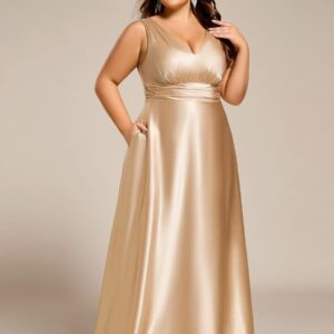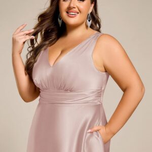 This plus-size satin maxi bridesmaid dress offers a blend of comfort and elegance. The empire waist design flatters every figure, while the soft satin fabric creates a smooth, luxurious look. Convenient side pockets add a practical touch, making it perfect for weddings and formal events where both style and functionality are key.