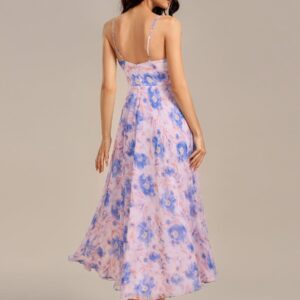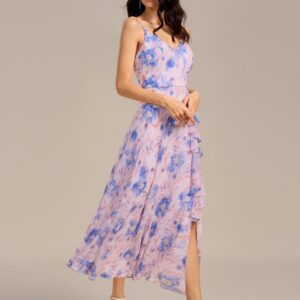 This enchanting maxi dress features a flattering V-neckline and charming ruffles that add elegance to any occasion. The soft floral print in delicate pastel colors enhances its romantic appeal, while the side split offers a playful touch and ease of movement. Ideal for bridesmaids or summer events, this dress combines comfort and style effortlessly.