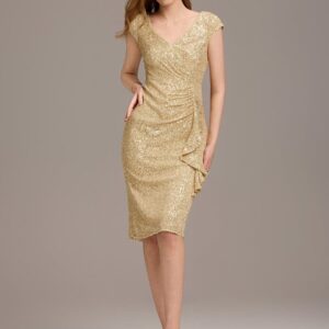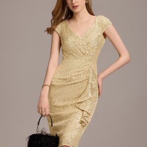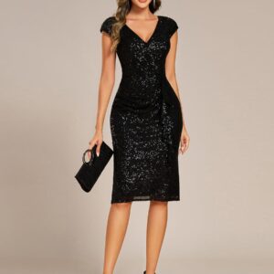 This elegant black bodycon dress is designed with all-over sequins for a striking look. Featuring a flattering V-neckline and cap sleeves, it beautifully accentuates the figure, making it perfect for evening events or cocktail parties.