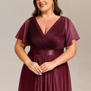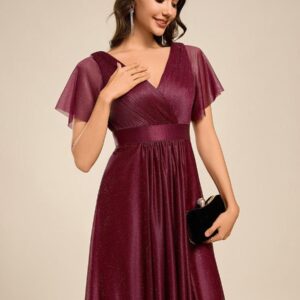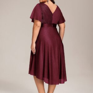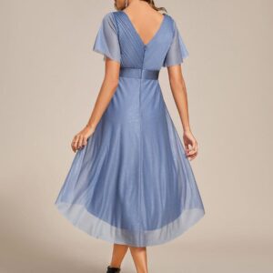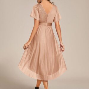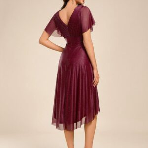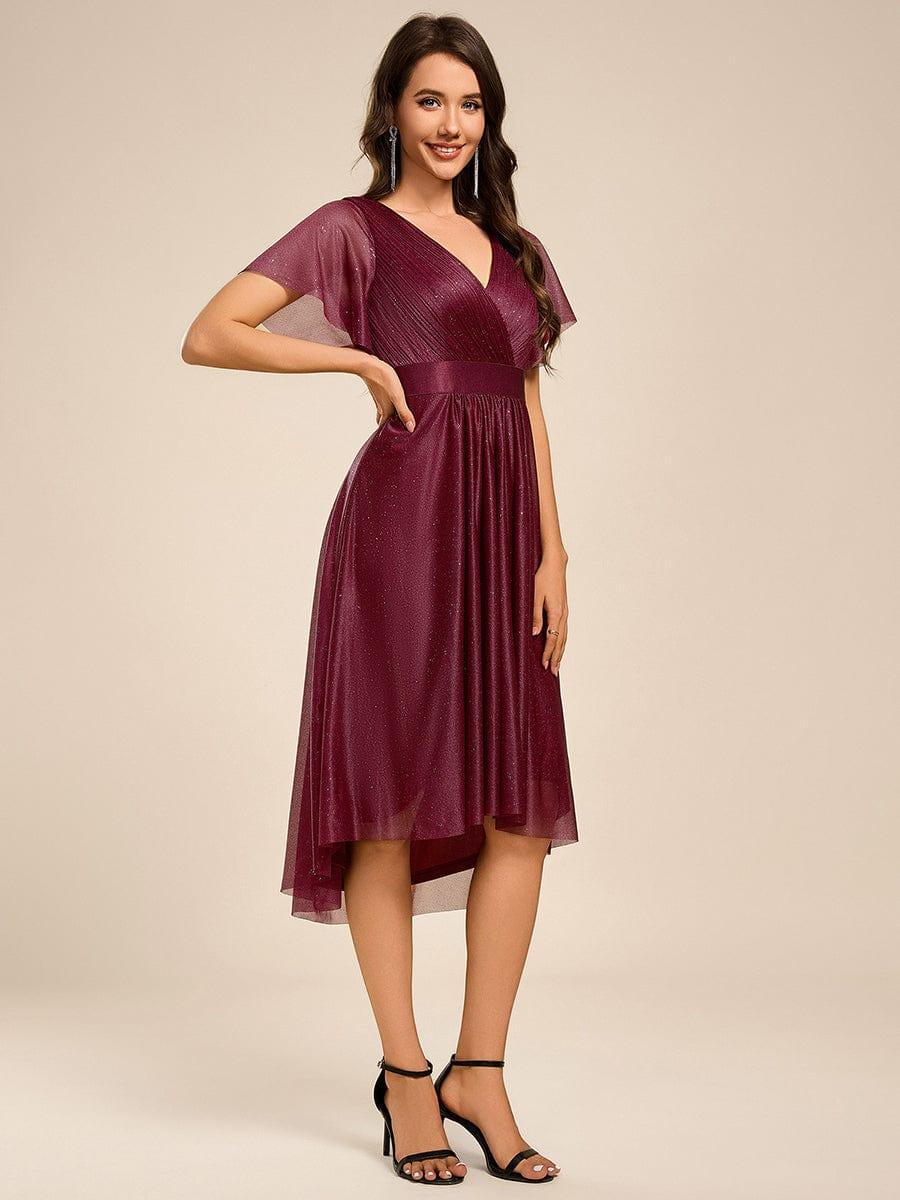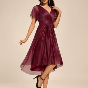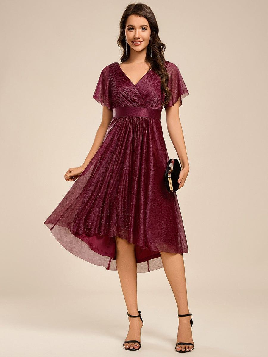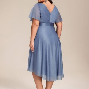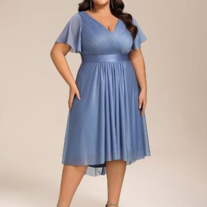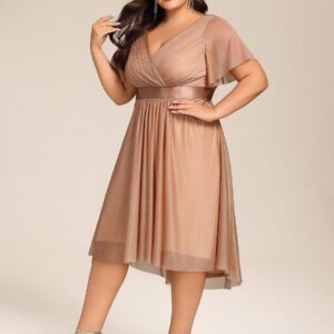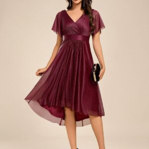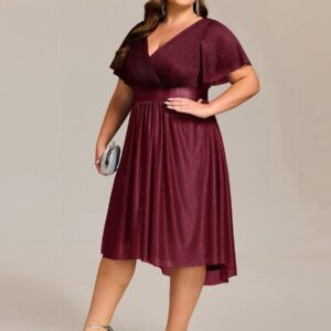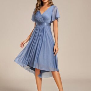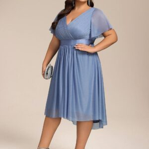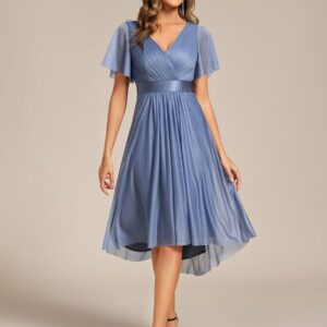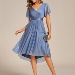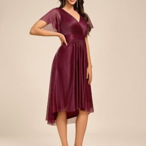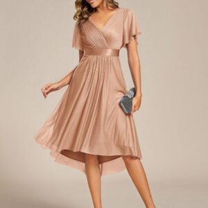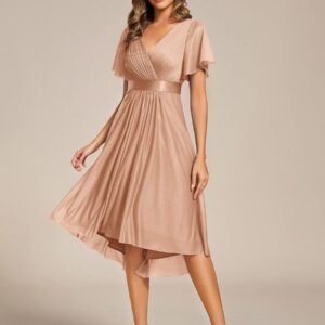 Step into the spotlight in our Short Sleeve V-Neck Pleated Asymmetrical Midi Wedding Guest Dress! This stunning piece features a flattering V-neckline and elegantly pleated detailing that adds texture and movement. The asymmetrical hemline creates a modern twist, making it perfect for both formal and semi-formal occasions. Whether you’re dancing the night away or mingling at the reception, you’ll radiate style and grace in this must-have wedding guest outfit!