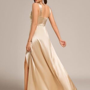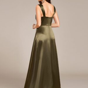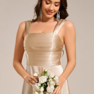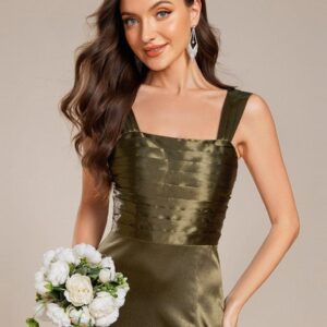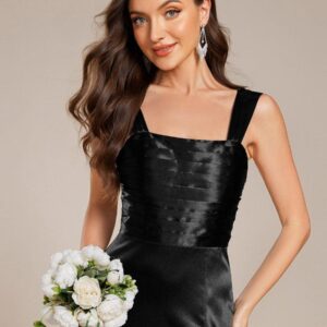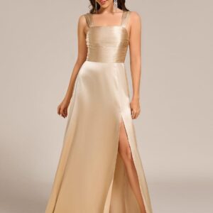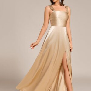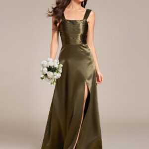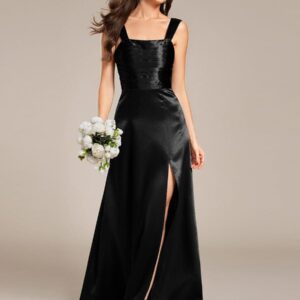 Exude timeless elegance in this square neck satin maxi bridesmaid dress. The sleek silhouette features a daring front slit for a modern touch and ease of movement. Perfectly balanced with its simple yet striking design, this dress complements a range of wedding themes.